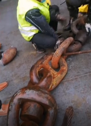 4、用專用機(jī)器夾住惰鏈,再用錨機(jī)把惰鏈放出擺在甲板上,等到另外的連接鏈環(huán)放到甲板上。